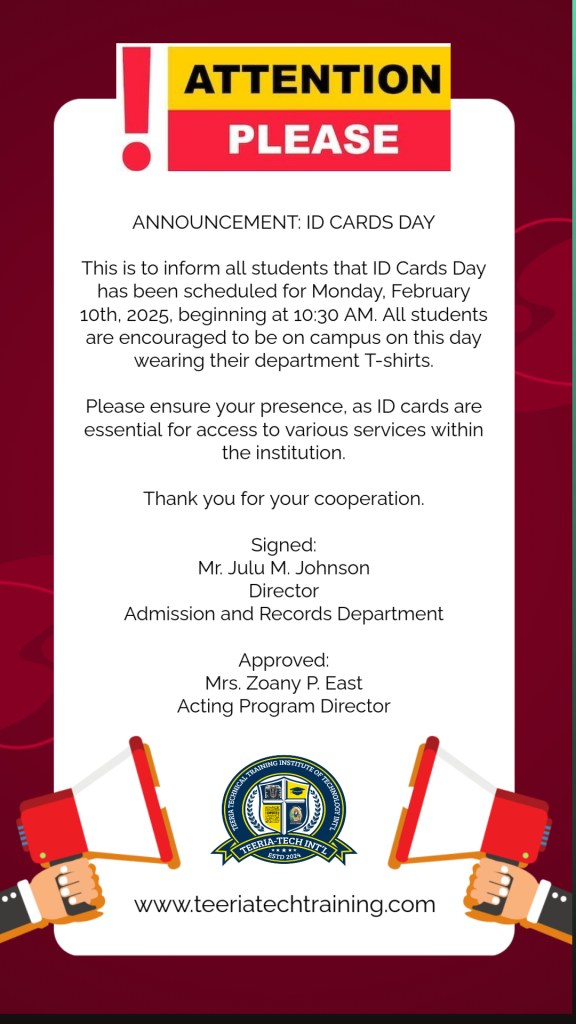 All students should know that ID Cards Day is planned for Monday, February 10th, 2025. The event will start at 10:30 AM. All students are encouraged to be on campus on this day wearing their department T-shirts. Please make sure your presence, as ID cards are essential for access to various services within the institution. Thank you for your cooperation.